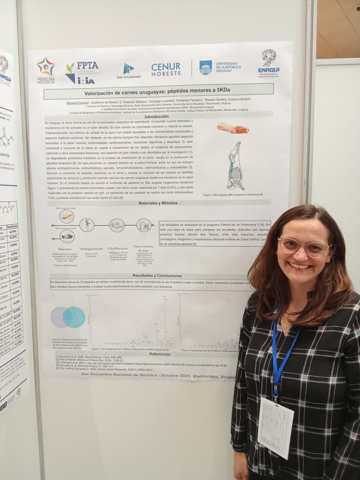En el marco del proyecto FPTA Valorización de la carne vacuna uruguaya a partir de su aporte de vitaminas del complejo B y de péptidos bioactivos. Desde el 21 al 24 de setiembre en Punta del Este Cristina Olivaro, Federico Wallace, Guillermo de Souza, Fernando Ferreira Adriana Soria y Micaela Escobal participaron de XXVIII Reunión de la Asociación Latinoamericana de Producción Animal y 8º Congreso de la Asociación Uruguaya de Producción Animal. https://www.reunionalpa2025.com/ Se presentaron dos pósters titulados:
