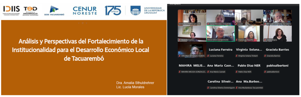 - 2025: Participación en el IX encuentro de Investigadores del área social del Noreste organizado por el Núcleo de Estudios de Frontera. Ponencia compartida “Análisis y Perspectivas del Fortalecimiento de la Institucionalidad para el Desarrollo Económico Local de Tacuarembó”. Trabajo en coautoría con la Lic. Lucía Morales. 9 de diciembre.